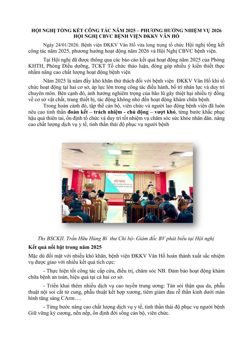 Trang chủ >> Tin trong ngành >> HỘI NGHỊ TỔNG KẾT CÔNG TÁC NĂM 2025 BỆNH VIỆN ĐKKV VÂN HỒ