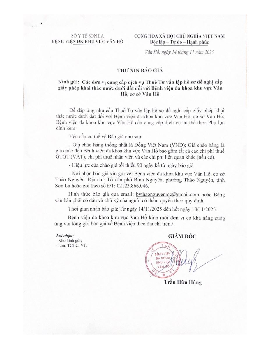 Trang chủ >> Tin trong ngành >> THƯ XIN BÁO GIÁ TƯ VẤN LẬP HỒ SƠ KHAI THÁC NƯỚC DƯỚI ĐẤT